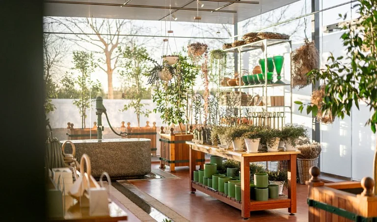 The new Garden Shop, also known as the Tuinwinkel, is a glass cube that seamlessly connects to the existing Scented Room, creating a fusion between home and garden. Trellised wooden walls washed in reseda green, a floral mural and a sun-soaked greenhouse create a serene space that celebrates all things green and growing. Bespoke gardening tools, fascinating plants and rare bonsai trees are available for purchase. Visitors can also unwind in the cosy reading nook or browse the captivating selection of books and puzzles.